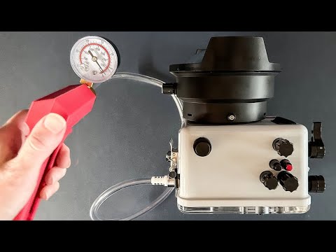 Vacuum valve fitting for older housings without a spare 1/2" diameter accessory port. The valve's low profile avoids interference with control operation. The included waterproof plug is secured to the fitting to prevent accidental loss. Vacuum pump with gauge included.
